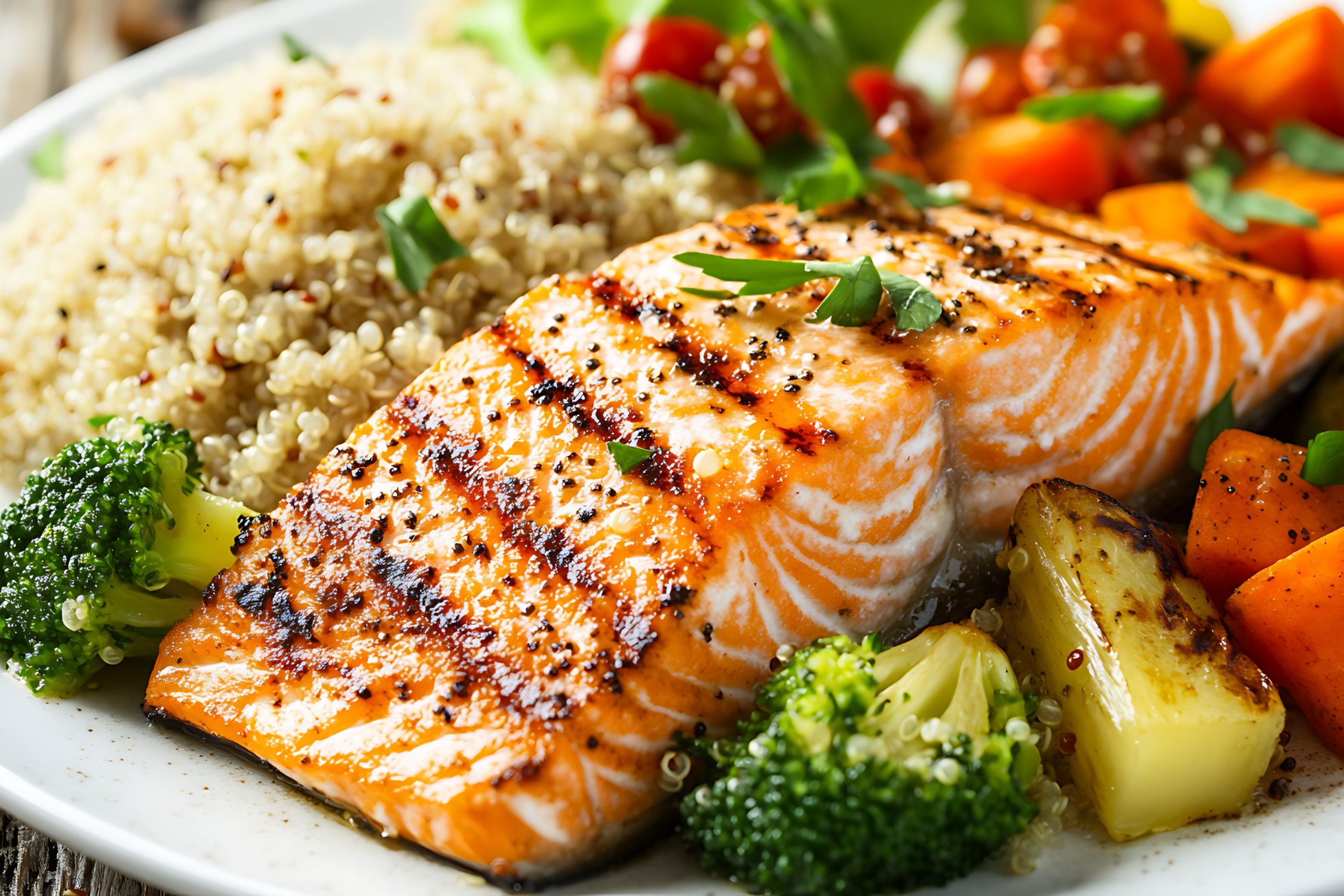 Gedünstetes Gemüse mit Quinoa und Lachs: Brokkoli, Zucchini und Karotten schonend dämpfen, mit Quinoa und im Ofen gegartem Lachs servieren. Olivenöl und Kräuter sparsam zugeben.