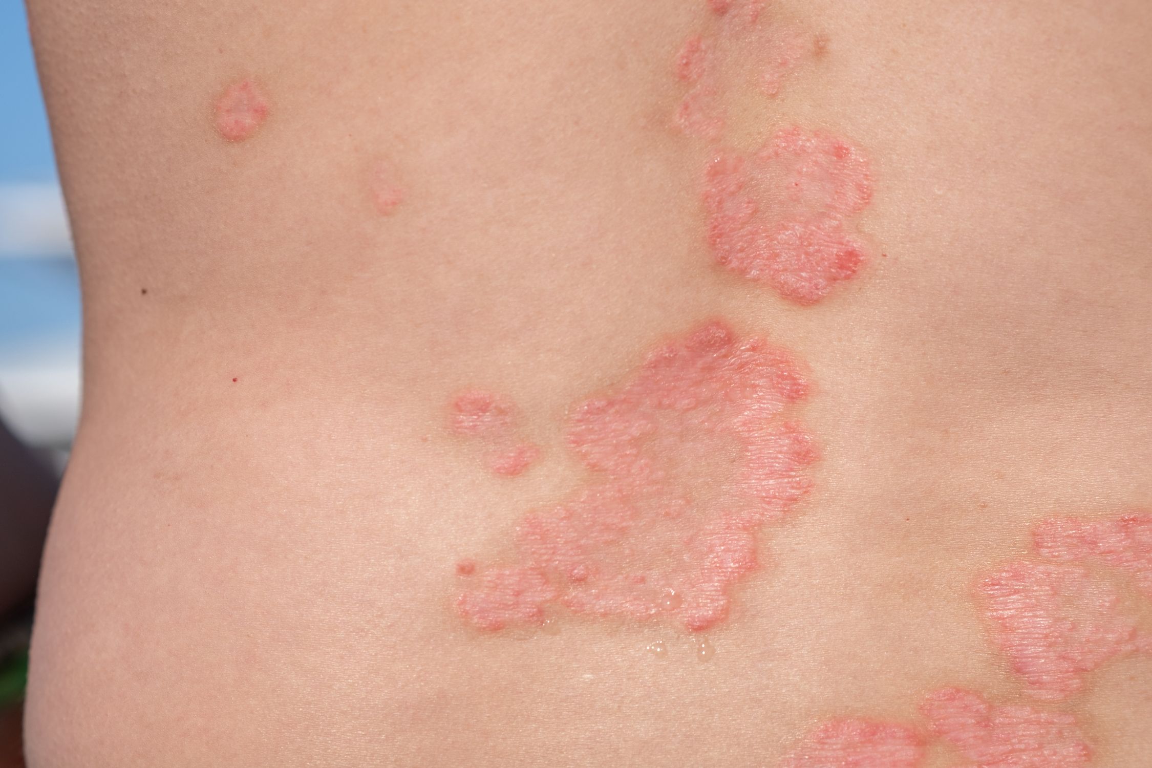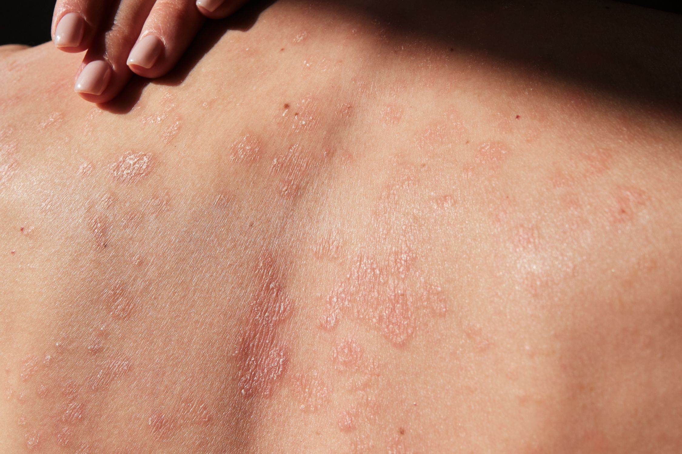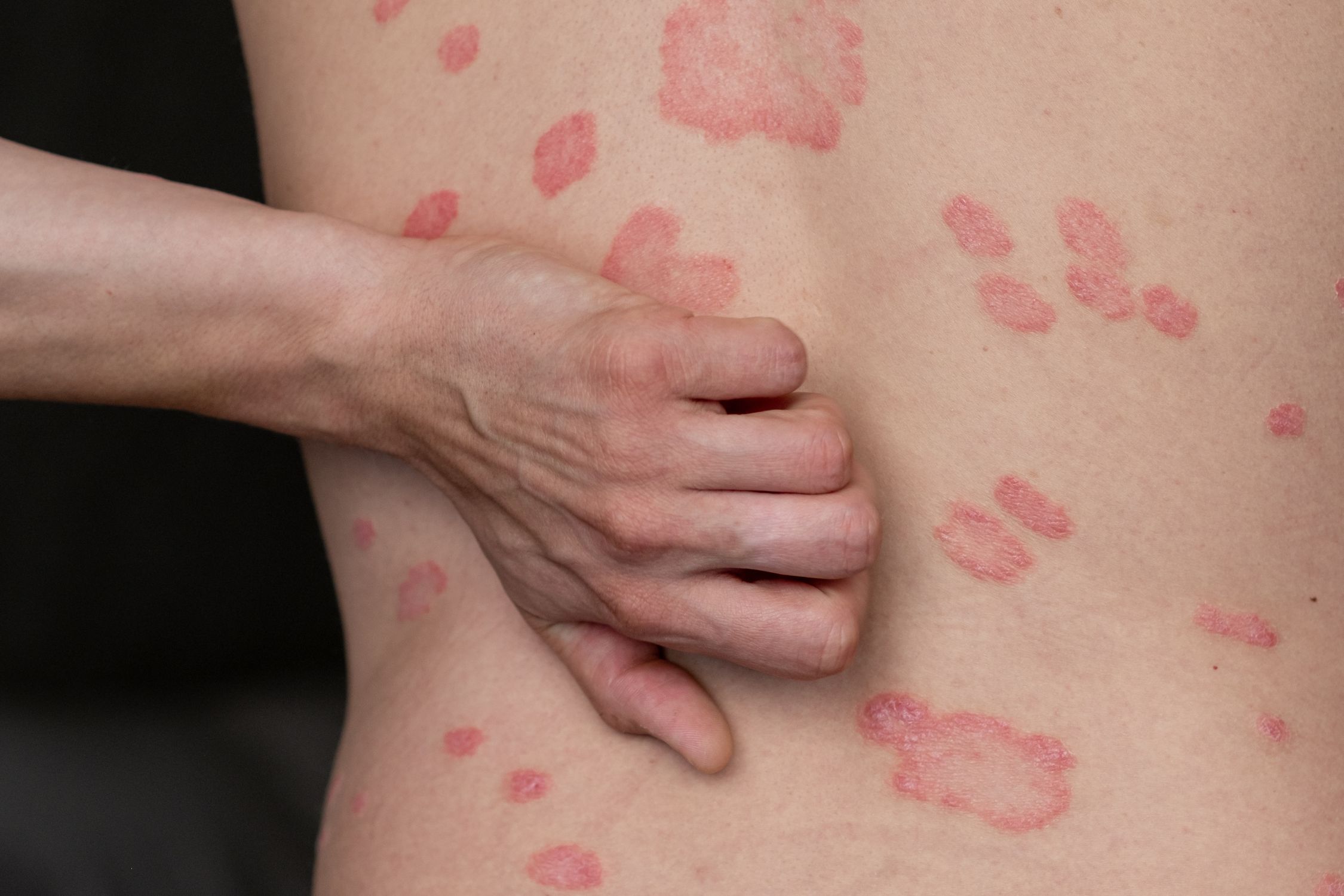 Die geröteten, schuppigen Flecken auf der Haut sind meist scharf von gesunden Hautstellen abgegrenzt und jucken oft stark.
